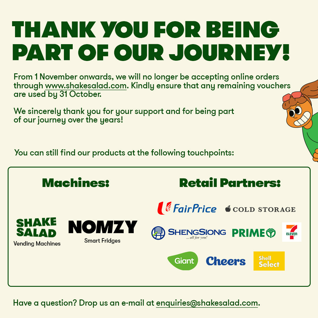 From 1 Nov onwards, we'll only no longer be accepting online orders. Find our products in retail stores and our machines!