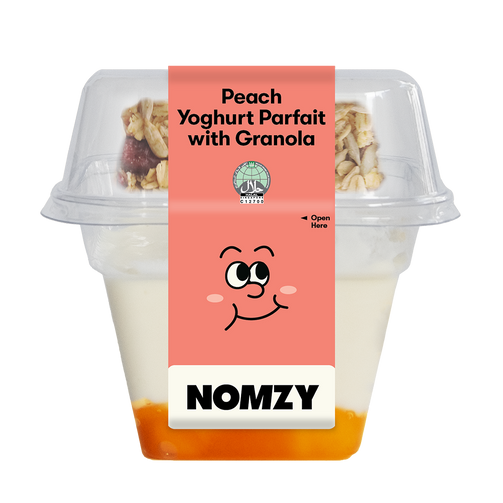 Ingredients: Greek Yoghurt (Milk, Milk Solids, Cream, Yogurt Cultures (S. Themophilus & L. Bulgaricus)), Peach Chunks (Peach(50%), Sugar, Water, Stabilizers (1442, 440), Peach Nature-identical Flavour, Acidity Regulator (330), Artificial Food Colorant (124)), Maple Baked Granola (Rolled Oats, Sunflower Seeds, Cranberries, Almonds, Walnuts, Olive Oil, Maple Syrup (Sugar, Glucose, Natural Identical Flavour, Citric Acid)
