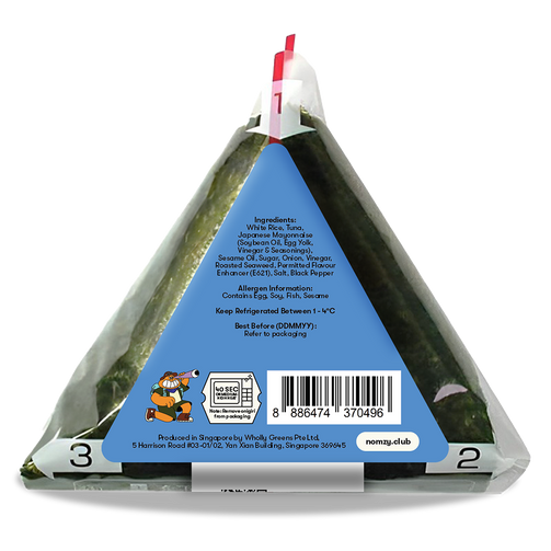 Ingredients: White Rice, Tuna, Japanese Mayonnaise (Soybean Oil, Egg Yolk, Vinegar & Seasonings), Sesame Oil, Sugar, Onion, Vinegar, Roasted Seaweed, Permitted Flavour Enhancer (E621), Salt, Black Pepper